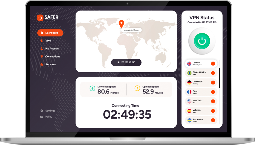 Our service allows you to hide your geolocation, bypass blocking and protect your data. Join over 150 thouthand people who trust Safer to keep their life safe.
